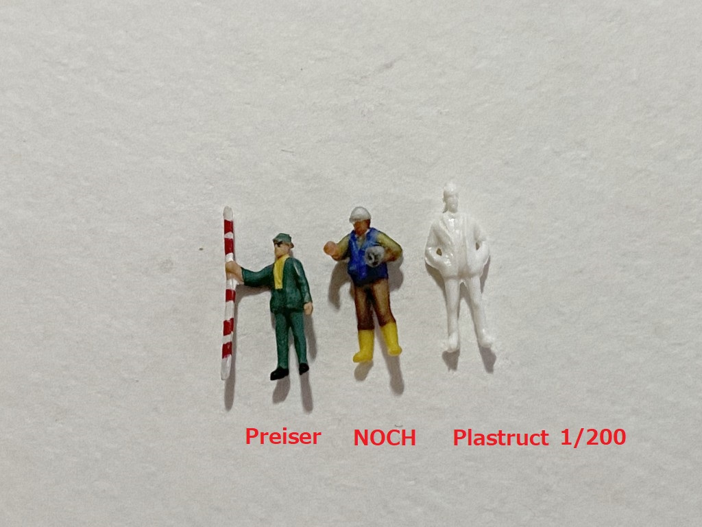 Preiserの人形よりも大きく見えたんですけども、Plastructの建築模型用1/200スケールと比較すると少し小さいです。身長差ってことで我慢できる範囲かもしれません。3Dプリンタ出力ってことで、あまり細くできないのか全体的に太めではありますね。